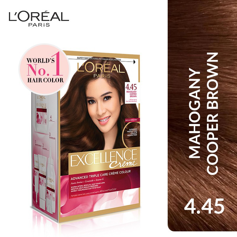 Cat rambut warna coklat mahogany sekarang ini sudah banyak dikeluarkan oleh beberapa produsen pewarna rambut seperti loreal miranda dan lainnya. Warna kuning namun lebih dari kuning seperti biasanya warna gold hasil karya dari loreal sangat menawan dan juga indah. Jual loreal paris excellence creme 445 cat rambut mahogany copper brown.