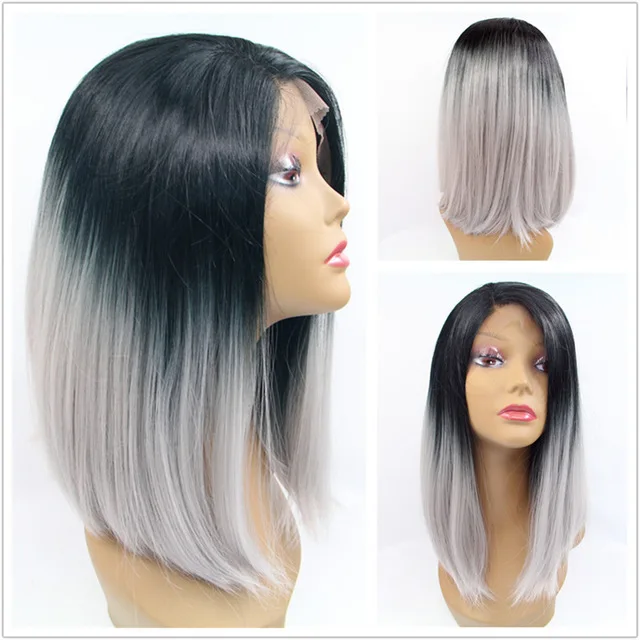 Pendek Gaya Rambut Bob Akar Gelap Ombre Abu Abu Lace Wig Depan Hitam